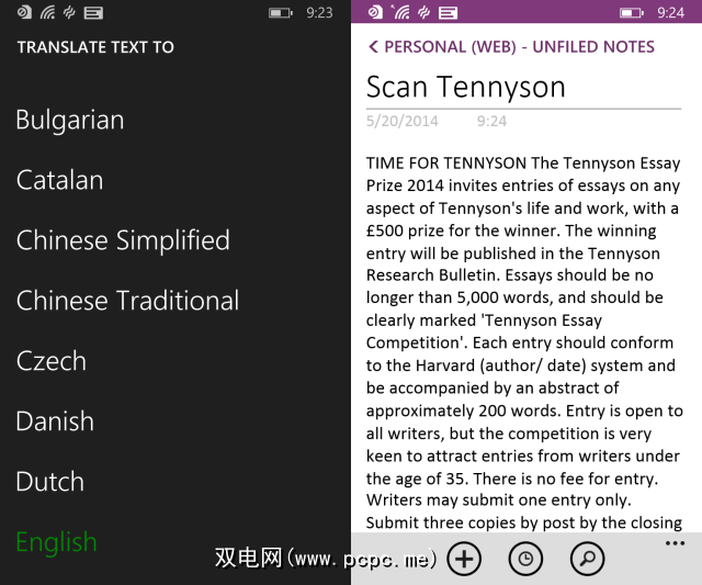 成功扫描将为您提供两个选择–将菜单展开为全部复制或使用翻译按钮将选择内容转换为多种国际语言之一。您可以将复制的扫描文本粘贴到Word,OneNote或电子邮件中。