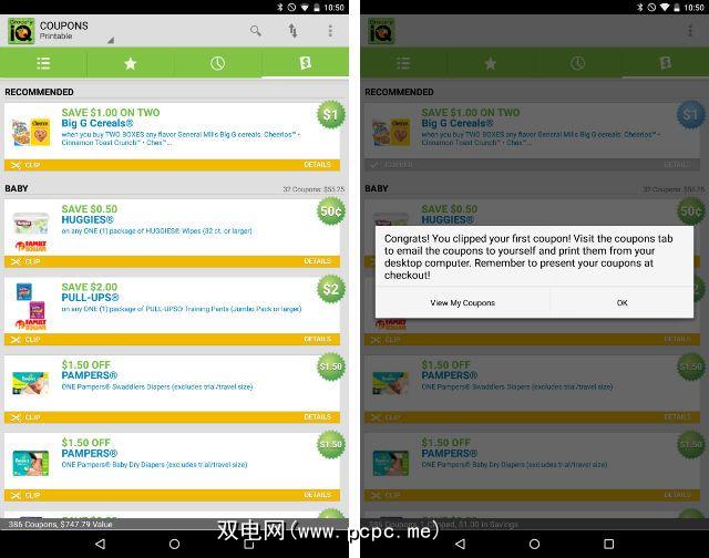 然后有优惠券,这是购物时省钱的绝佳方法之一。 Grocery IQ为您提供了可以节省金钱的产品列表。轻按您想要的“剪辑",将其添加到列表中。您可以从那里通过电子邮件将其发送给自己,打印出来,然后在商店中使用。