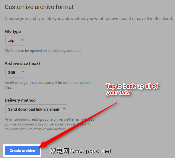 在下一个屏幕上,默认值几乎适用于任何人。选择创建存档以备份您的数据。如果您使用环聊进行SMS消息传递,则只会保存环聊到环聊消息,而不会保存您的SMS消息。