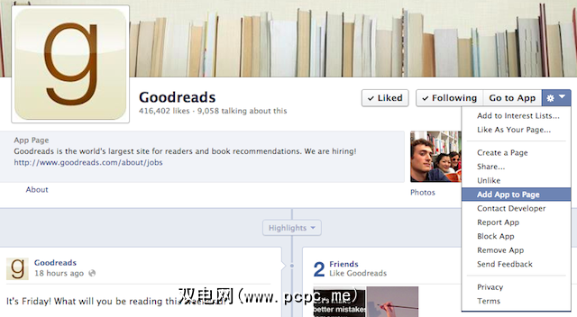 以上连接Goodreads的方法进入Facebook是第一步,说明以下所有内容。但是,即使是像将其他任何应用(例如Pinterest)添加到Facebook Page一样简单,也没有多少人意识到其他选项的工作原理。首先,出于您的意图,您需要已经创建了一个Facebook Page。如果您将其链接到Goodreads组,也需要预先创建它。