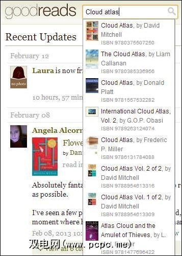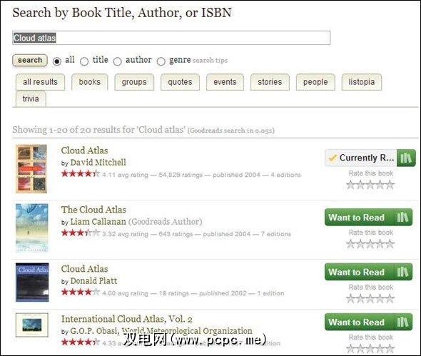 您可以键入标题,作者或ISBN。我经常从亚马逊页面上复制ISBN并将其粘贴到Goodreads中,以便对书有第二意见。您在上方看到的是即时结果视图。按下Enter键,您会发现自己在完整的结果页面中(这是Cloud Atlas的页面,只需单击链接即可在浏览器中将其打开以查看更清晰的视图):