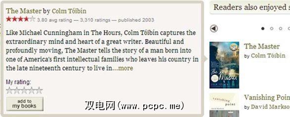 此信息面板,虽然很丰富,但还远远不够完整:如果包含这本书的体裁会更好。不过,您仍然可以轻松地使用面板将书添加到阅读清单中,或者对已经阅读的书进行评分。当然,您也可以单击以转到完整的书籍页面。