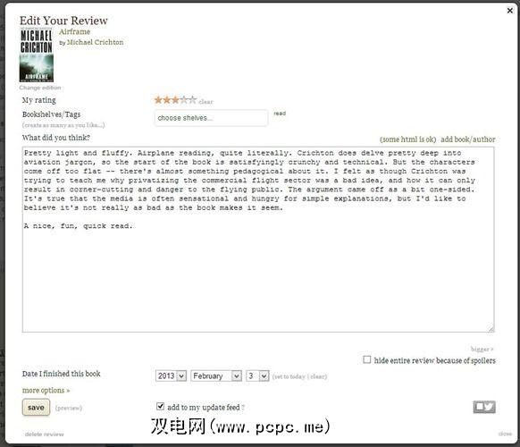 最后,Goodreads可以让您指定完成书的日期(方便使用,如后所述),隐藏评论,如果其中包含剧透内容,则将其隐藏,当然,还可以发布该评论。