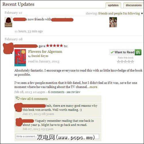 Goodreads可让您与其他人成为朋友,并跟随他们查看他们阅读的内容以及对书的看法。对于某些人,我认为这是Goodreads体验的核心。我想这取决于您的个人风格: