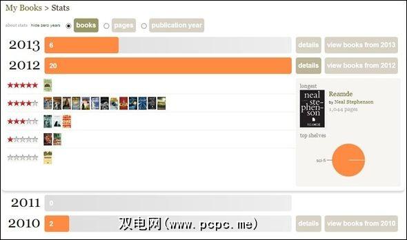 一旦您告诉Goodreads足够了解您的阅读历史和习惯(或者只是使用该服务足够长时间并保持最新状态),其“统计信息"视图可在“我的图书">“统计"下访问,可以显示有关您的阅读的有趣花絮: