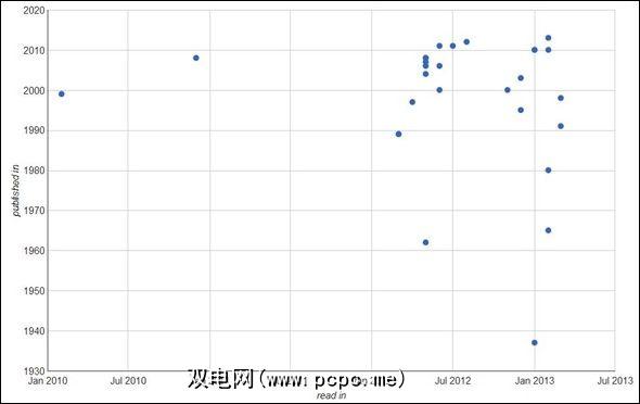 此相对于每本书的出版年份(Y轴)绘制您的阅读年份(沿X轴)。乍一看,尽管我今年早些时候一直在尝试更多经典读物,但我对新近的书还是有很大的偏见(在一月份,我读过约翰·斯坦贝克的《老鼠与男人》,原本出版于1937年)。