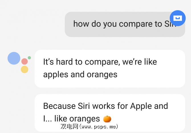当被问到“您如何与Siri进行比较?"时,Google助手回答“很难比较,我们就像苹果和橘子。因为Siri适用于Apple,而我……就像橘子一样。"