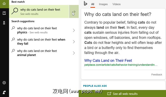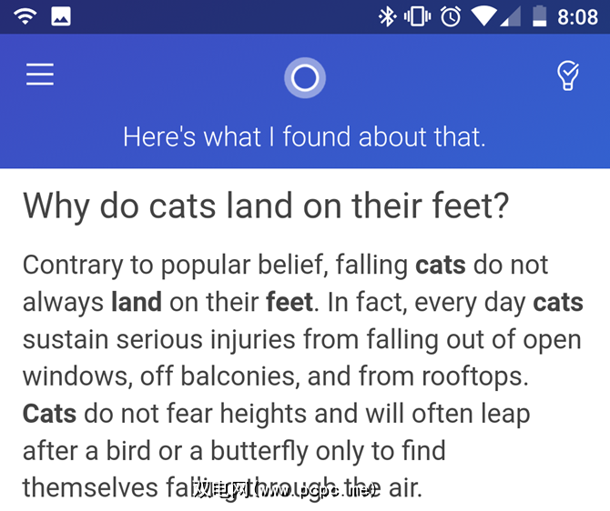 当我在Cortana应用程序中尝试此操作时,所得信息与从Google Assistant接收到的信息有些矛盾。 Cortana从petplace.com上获取了信息,并指出猫并不总是脚踩着。
