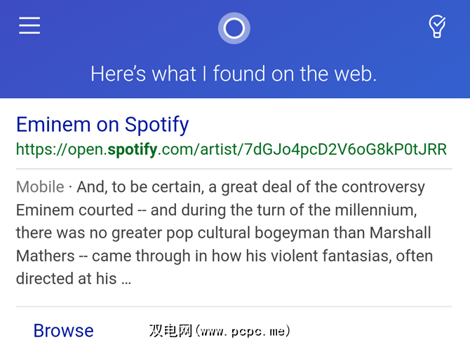 这是Cortana开始崩溃的区域。需要与其他服务或设备集成的任何内容仍然是Cortana的主要弱点。 Cortana应用程序没有这种集成,因此,当您要求它扮演艺术家的角色时,它只会在网络上查找信息。