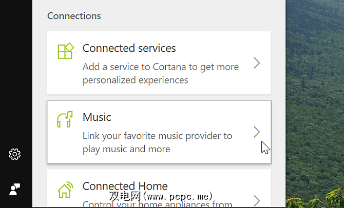 不过,可以通过输入 Cortana Notebook 将音乐帐户与台式机上的Cortana集成。 >,然后依次转到连接和音乐。