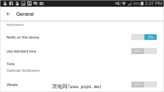在您的Android设备上,您将在Google日历应用中进行这些更改。再次从应用程序菜单导航到您的设置。然后,点击常规。向下滚动时,您会看到用于启用或禁用通知,使用标准或其他警报音以及打开或关闭振动的选项。