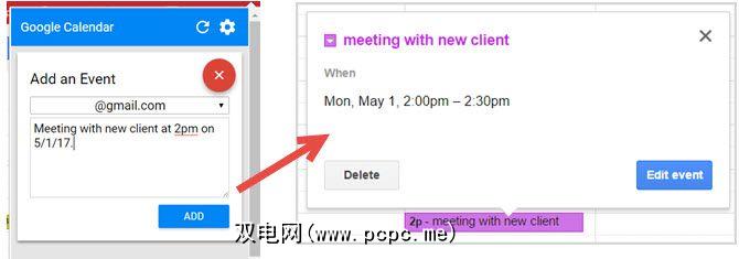 例如,您可以输入“明天中午和妈妈一起午餐"或“下午2点与新客户开会"在5/1/17"。点击添加,该事件及其通知将立即弹出到Google日历上。