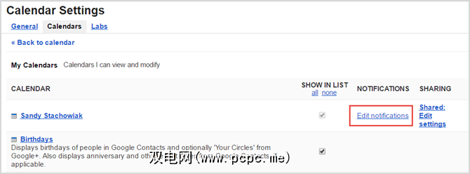 如果您只想在网络上更改日历的通知,请单击齿轮图标,然后选择设置。然后,点击日历标签。在您要更改的日历的右侧,点击编辑通知链接。