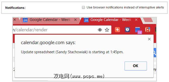 相反,您可以使用浏览器警报,它将打开桌面上的通知,可以选择播放声音。看到它之后,只需单击 X 将其关闭,或单击警报本身以在浏览器中打开Google日历事件。