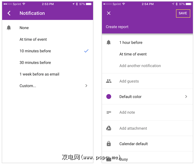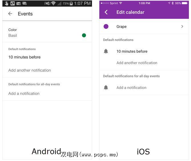 然后,在两台设备上,点击日历下的事件你想改变。然后,您可以调整定时事件和全天事件的默认通知,并创建其他事件。