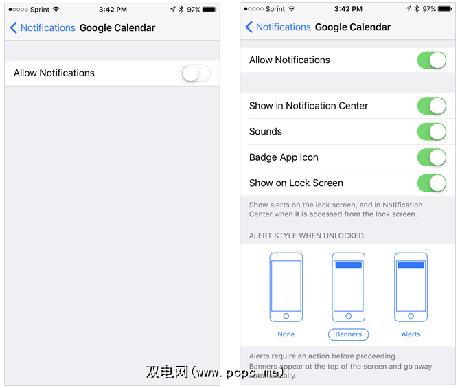 在iOS设备上,您将对自己进行这些更改 device 设置,而不是 app 设置。打开设备设置,点击通知,然后向下滚动并点击 Google日历。然后,您可以启用或禁用通知,选择徽章应用程序图标,选择警报样式以及激活锁屏显示,就像对其他已安装的应用程序一样。