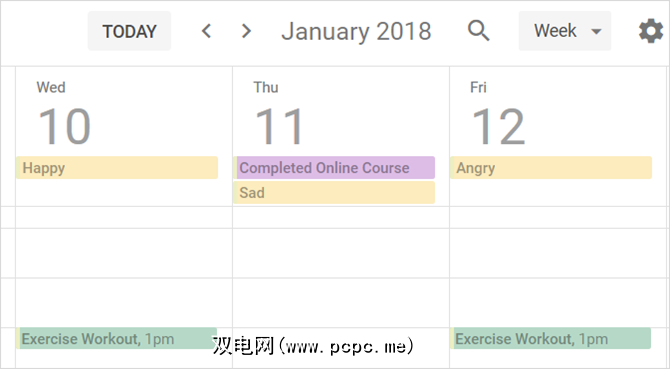 另一种有用的颜色编码用法是在仅使用一个日历时识别条目。因此,您可以将黄色用于心情跟踪条目,将绿色用于锻炼条目,将紫色用于桶列表条目。