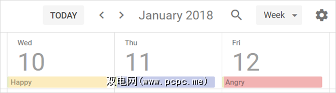 您可以添加一个事件并将其命名为心情,如快乐,悲伤或愤怒。然后使用黄色表示高兴,蓝色表示悲伤,红色表示生气。