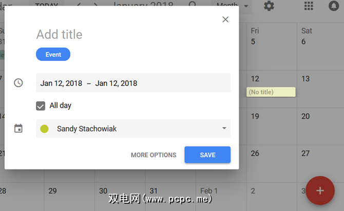 要添加新项目在Google日历主屏幕上,您可以单击日期以进行快速输入。然后,如果要添加详细信息,请从弹出窗口中选择更多选项。您也可以点击右下角的红色加号图标直接进入事件详细信息页面。