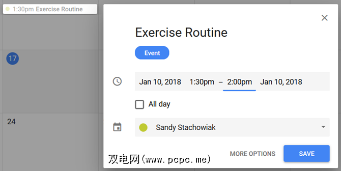 假设您要在完成锻炼程序后对其进行跟踪。您可能不需要很多细节,因此快速输入会很好。单击锻炼的日期,为其命名,然后取消选中全天选项,以便您可以添加锻炼的持续时间。然后,点击保存。