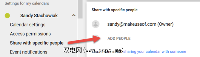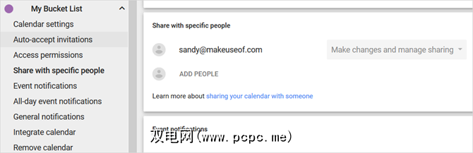 如果您想查看新日历的其他选项,请点击<顶部的strong>齿轮图标。在设置页面中,选择您的日历。在这里,您可以与特定的人共享它,也可以获取链接以将其与许多其他选项集成在一起。