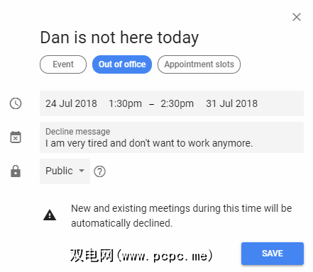 Google日历现在提供了不在办公室的设置。启用它后,在此期间收到的所有会议邀请都将自动被拒绝。您可以自定义其他人可以看到的消息,还可以控制哪些用户将收到该消息。
