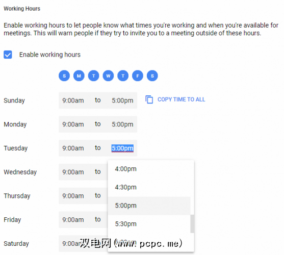要在Google日历上设置您的工作时间,请转到设置>常规>工作时间。