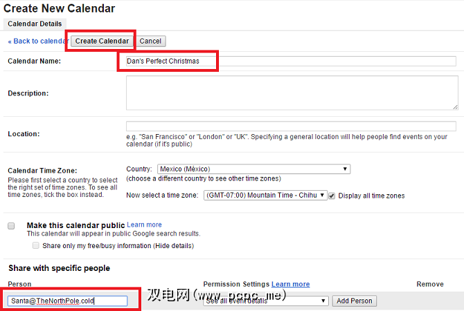 输入适当的名称并填写电子邮件地址要与之共享的人,然后点击创建日历。