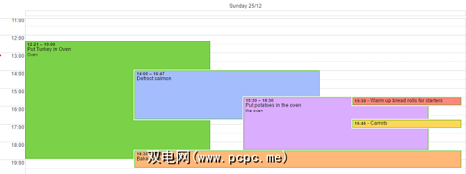 Google日历可以为您提供帮助。在圣诞节那天,为您需要烹饪的每个食物创建一个事件,并在描述中添加重要信息,例如烹饪温度。