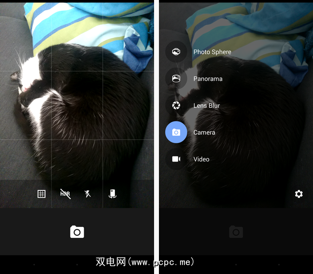 Google摄像头界面没有太多操作-焦点显然在您的拍摄对象上,而不是屏幕上的任何按钮上。在右上角,您可以看到用于切换构图网格,HDR模式,闪光灯和前置/后置摄像头的菜单。左上角,您可以看到用于选择相机支持的五种模式的菜单-Photo Sphere,全景,镜头模糊,常规静态相机和视频摄影。
