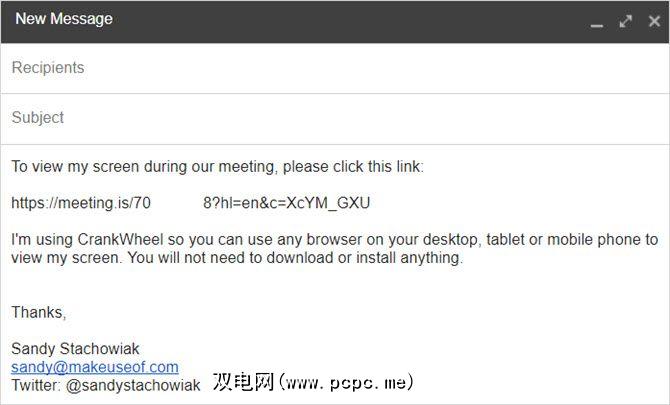 CrankWheel的另一个重要功能是您可以安排会议来共享您的屏幕。从“ CrankWheel"窗口中单击该按钮,然后为您的会议命名并复制带有链接的文本。然后,您可以将其添加到会议请求或参与者的电子邮件中。