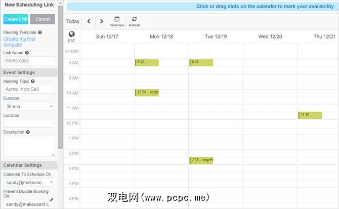 您可以从收件箱中直接弹出Google日历,然后选择可能的会议时间。选择一个主题,持续时间,位置并添加描述,然后将链接复制并粘贴到您的电子邮件中。当您的收件人单击链接时,他们将被带到Meetingbird.com,在那里他们可以看到您的可用时间。