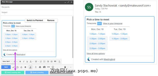 Meetingbird的另一个方便功能是将您的可用时间插入到电子邮件中。收件人可以直接在邮件中看到您的时间,然后单击一个即可在Meetingbird.com上保留该时间段。