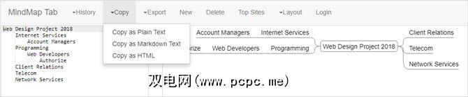 您可以将思维导图复制为纯文本,降价或HTML或将其导出为图像文件。如果要创建其他思维导图,只需单击新建并为其命名。并且,您可以从集中于思维导图或文本的角度更改布局,这将使窗口的该部分更大。您也可以只查看思维导图或文本。