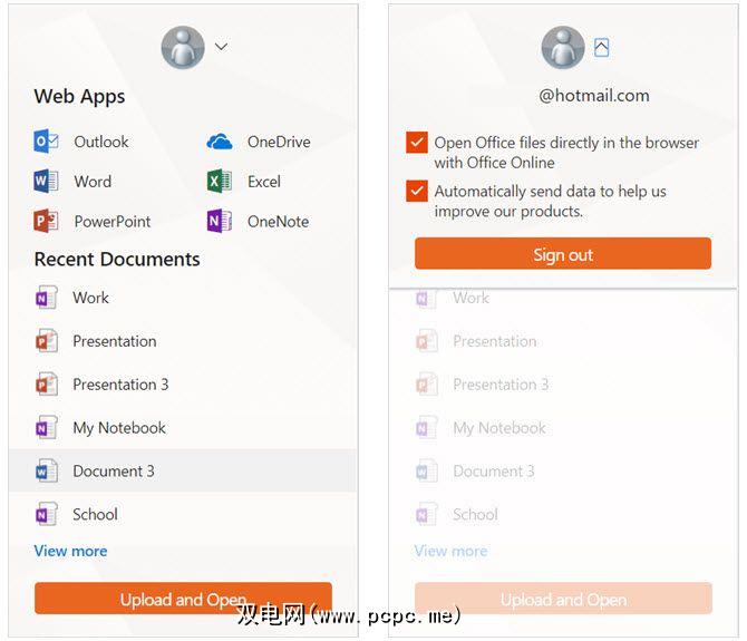 单击工具栏按钮,然后选择要打开的Web应用程序。您还可以查看近期文档的列表,或者上传并打开一个新文档。请注意,第一次使用扩展程序时,必须使用Microsoft帐户登录。而且,您可以通过单击个人资料图片旁边顶部的箭头来退出扩展程序。