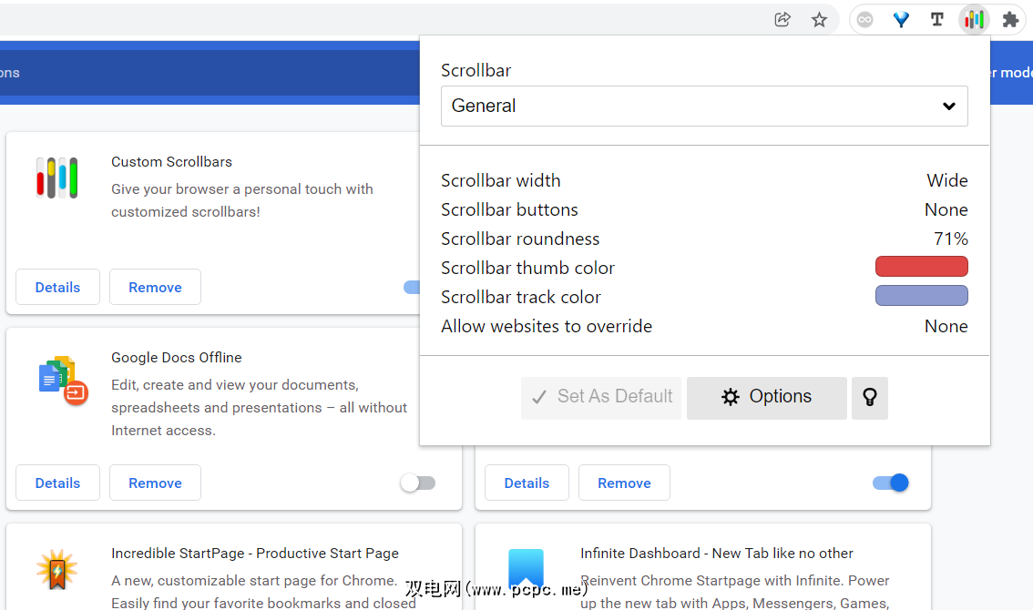 自定义滚动条是一个值得注意的扩展程序,它可以让您自定义 Chrome 的滚动条。它允许用户更改滚动条的配色方案、圆度和宽度。以下是使用自定义滚动条自定义 Chrome 滚动条的方法。