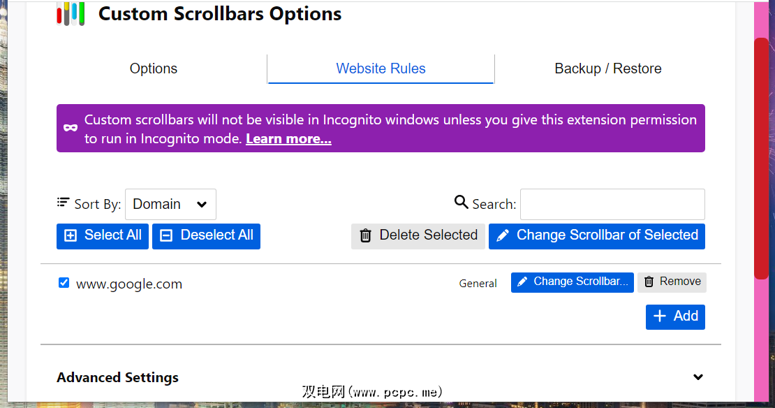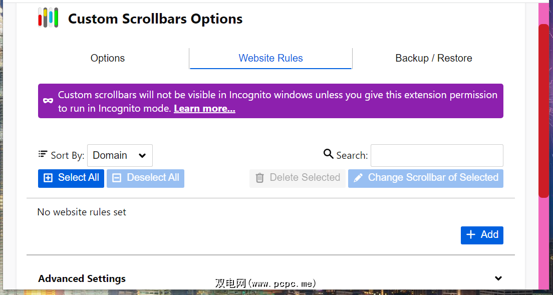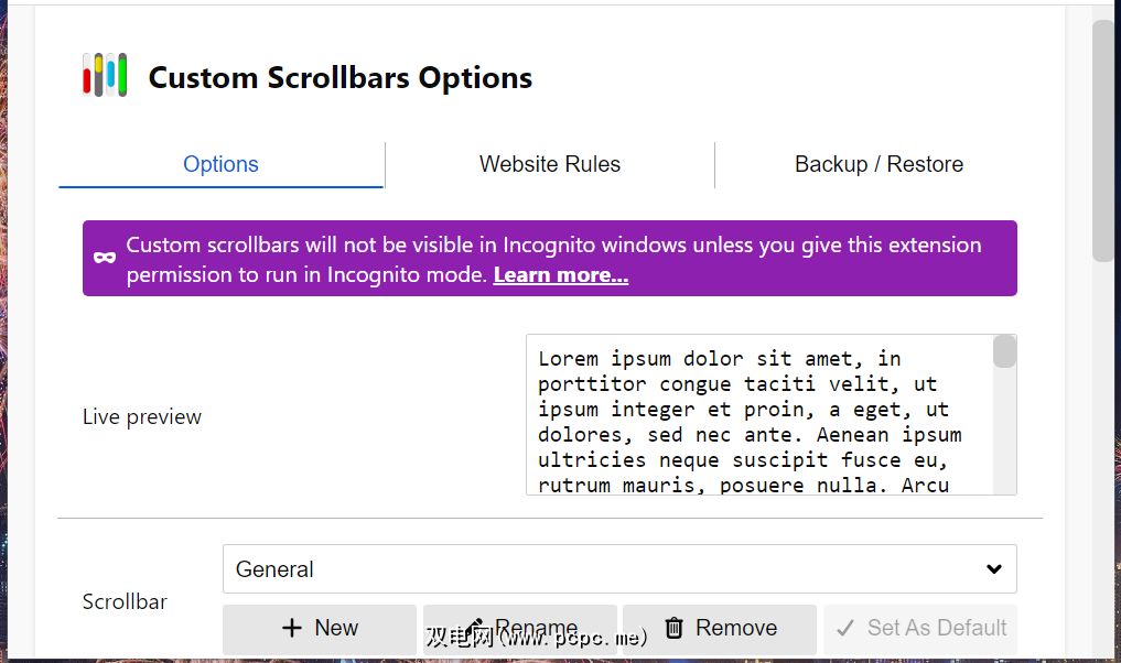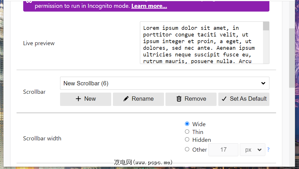 自定义滚动条使用户能够设置和保存替代滚动条自定义。然后您可以选择通过网站规则将不同的滚动条应用于特定站点。