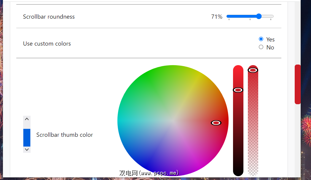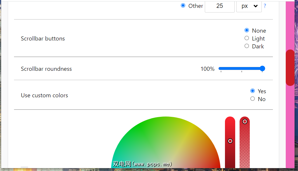 自定义滚动条最好的地方是它的颜色自定义选项。使用此扩展程序,您可以使用拇指和轨道调色板更改滚动条的拇指和轨道颜色。