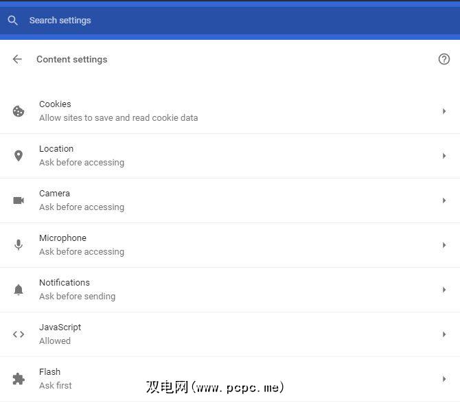 在内容设置菜单中,您还可以确保启用了Flash: