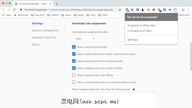 如果您大部分时间都在浏览器中度过,则应该安装的另一个扩展程序是The Great Suspender。该扩展程序可以确保您一段时间未使用的选项卡不会使计算机性能受到干扰,并且多任务处理体验仍然保持顺畅。