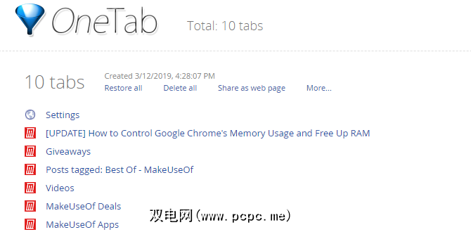 如果要暂停每个标签页,最好使用 OneTab 。该扩展程序将折叠您打开的每个选项卡,没有例外。它将所有选项卡移动到一个列表中。然后,您可以一键还原所有标签,还原选择的标签或将其永久关闭。