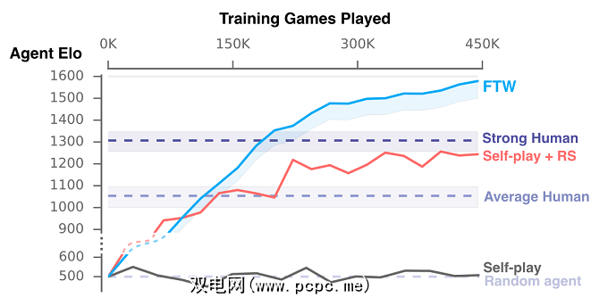在衡量他们的Elo评分时,Elo评分是一种用于在零和游戏中对玩家技能进行评分的指标,在训练过程中,FTW代理商超越了普通玩家和普通玩家的平均得分。