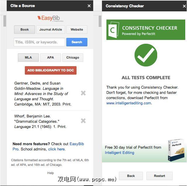 我注意到这些插件的一件令人担忧的事情是,有些开发人员可能会将它们用作广告。例如,Consistency Checker是PerfectIt的轻量级版本,一种校对软件,当您使用附加组件时,您会遇到指向PerfectIt免费试用版的链接。 EasyBib还拉皮条他们的专业版。我们希望这不会成为一种趋势。