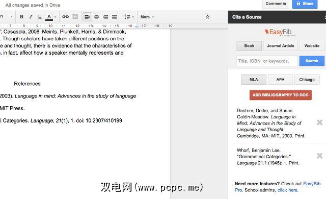 添加到文档中的每个参考都存储在边栏列表,然后单击即可插入MLA,APA或Chicago格式的书目。这大约是简单的书目创建就可以得到的。不幸的是,EasyBib不支持括号内的引文,因此您必须自己做。