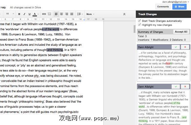 最好的部分之一使用Google文档的好处是,您可以通过允许他人访问您的文档来轻松地与他人合作。在出现Track Changes之前,除非您同意以特定颜色插入文本,否则您只会知道某人是否编辑了某些内容,而不是他们所做的更改。