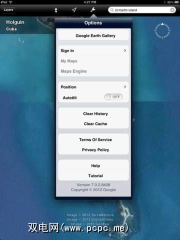 如果您点击屏幕顶部的扳手,就可以看到Google的设置地球。在这里,您可以登录自己的Google帐户并访问“我的地图"部分。您还可以调整该应用程序是否会自动倾斜以及更多。