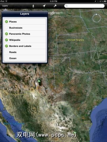 要真正利用该应用程序,您将需要点击屏幕左上方的“ <层>层"按钮。在这里,您可以轻松控制Google Earth在地图上覆盖的信息类型。您可以选择查看全景照片,企业,地点,边界,道路,海洋和Wikipedia文章。本质上,您想在地图上看到的任何东西都可以在Google Earth中找到,这在您进行虚拟旅行时非常有用。