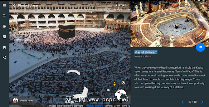 每年,成千上万的穆斯林朝着麦加朝圣,这座城市被认为是宗教上最神圣的圣地。 Google地球的虚拟之旅名为朝圣麦加" ,让您从降落在吉达麦加朝圣机场到最终目的地,即麦加清真寺的清真寺圣地,以虚拟方式体验朝圣。