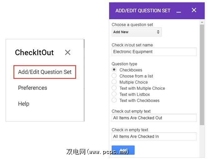 一旦安装了附件,设置就很简单。创建或打开表单,单击加载项按钮,然后选择 CheckItOut 。在弹出窗口中,选择添加/编辑问题集以创建您的问题。