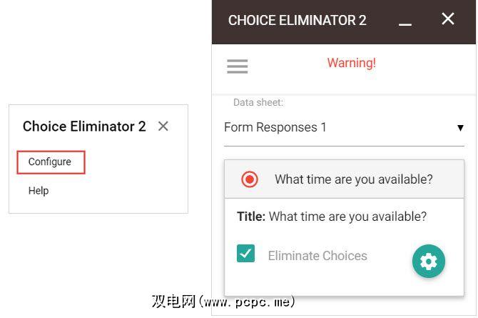 Once you install the add-on, create or open your form. Click the Add-ons button and select Choice Eliminator 2. In the pop-up window, pick Configure to create your question.